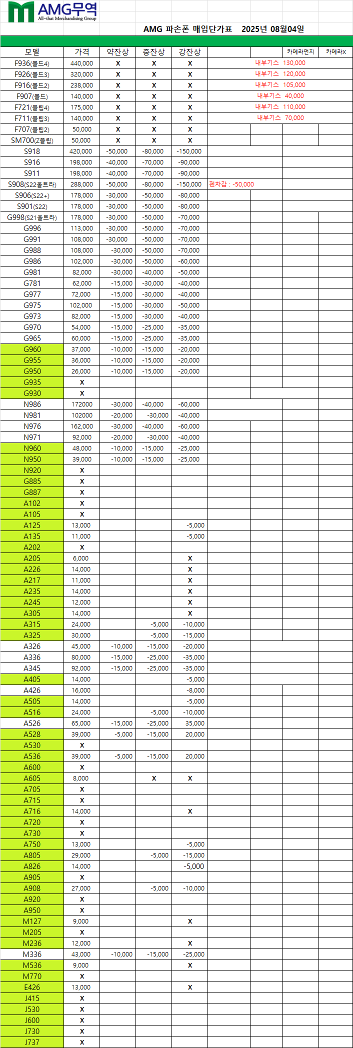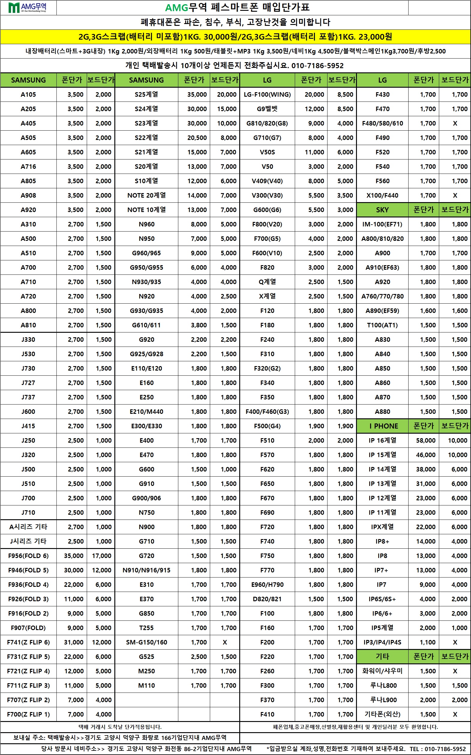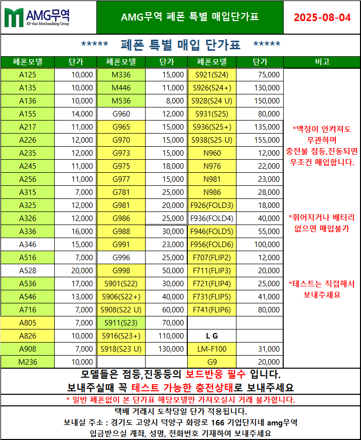 공지 폐휴대폰 및 파손폰,특가폰 매입단가표입니다(25년 7월31일 적용단가)